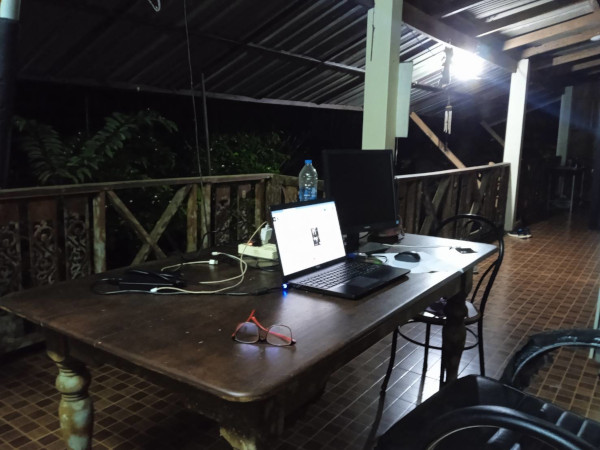 ตอนนี้ดูเวลา 5.40 น.แต่ยังมืดสนิท ฝนยังคงตกหนักตลอดเวลา หน้าระเบียงสำหรับทำงานลมพัดอากาศค่อนข้างเย็น แต่ยังนั่งทำงานได้สบาย มองดูยอดไม้ที่กระทบที่ขึ้นมาตรงระเบียงกระทบกับแสงไฟ ดูสงบ นิ่ง คล้ายชีวิตของตนเอง ตอนนี้ รู้สึกว่า สงบและนิ่งมีความสุข ได้ทบทวนหลายสิ่งหลายอย่าง ได้เตรียมตัวหลายสิ่งหลายอย่าง ได้พบกับคอมพิวเตอร์ที่ชอบและใช้งานได้ดี พิมพ์สะดวก คล่องตัว มีความเร็วดี ทน เสียดายเพิ่งซื้อมาใช้งาน หากใช้งานมาก่อนหน้านั้น งานหน้าจะออกมามากกว่านี้