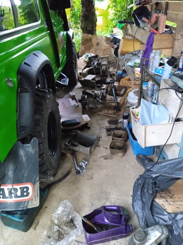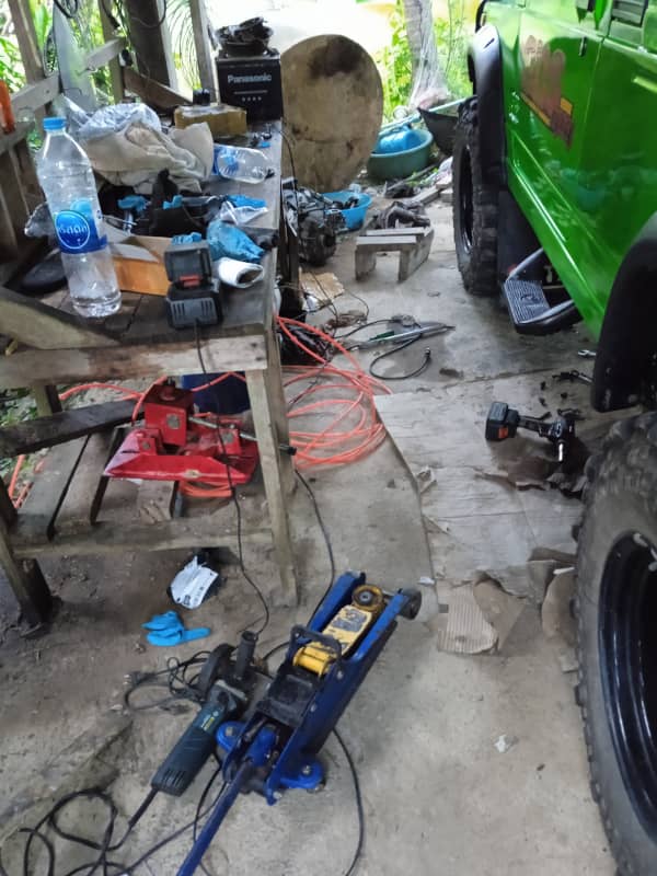 ปรากฏว่าตอนคิดมันง่าย ตอนวางแผนในใจมันง่าย ว่าจะใช้แม่แรงยก แล้วใช้ตัว adepter เป็นตัวช่วย ปัญหาตามมาเยอะมาก เพราะต้องยกด้านหลังให้สูงแล้วดันด้านหลังก่อน แล้วค่อยยกด้านหน้า สุดท้ายทำอยู่เกือบวัน ไม่เสร็จ ตัดสินใจยกกับมือ ยกได้เกือบเสร็จหมดแรงเลยหยุด ไม่กล้าทำต่อเพราะกลัวร่างกายจะมีปัญหา เนื่องจากสภาพร่างกายไม่เคยทำงานหนักมาก่อน สรุป ยังแต่ยกเพื่อให้เดือยเกียร์มันสวมกับลูกปืนฟลายวิล แต่มันไม่ไหว ปวดแขนมาก ตอนเช้าขึ้นมาคิดว่าจะหาวิธีการอย่างไร หากดันทุรังไป น่าจะเจ็บตัวมากกว่านี้ และไม่คุ้มกับที่ต้องอาจจะบาดเจ็บเพิ่ม เพราะความใจร้อนและรีบประกอบกับร่างกายรับไม่ไหว เลยหยุดพักอาบน้ำนอนเล่น
